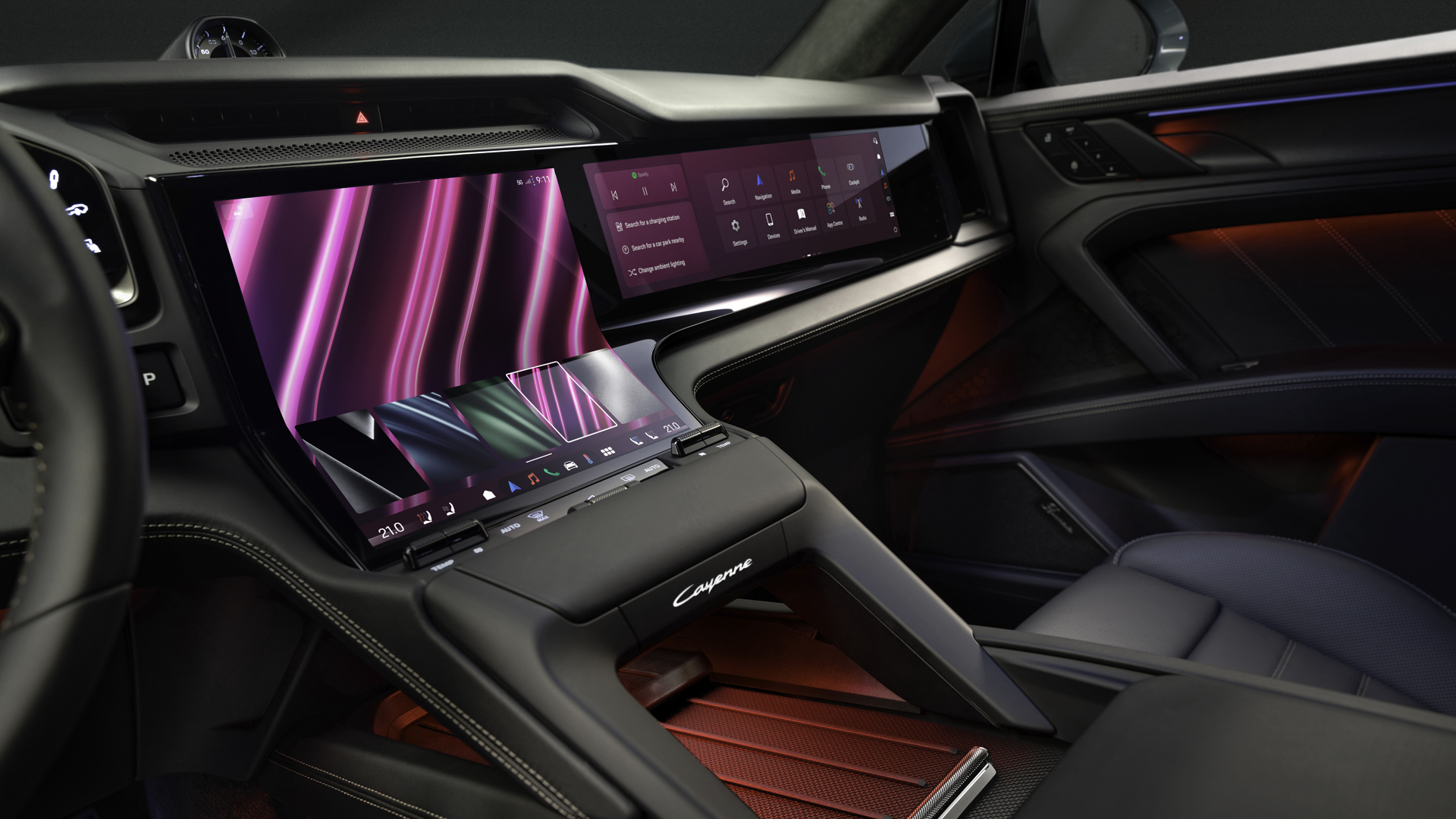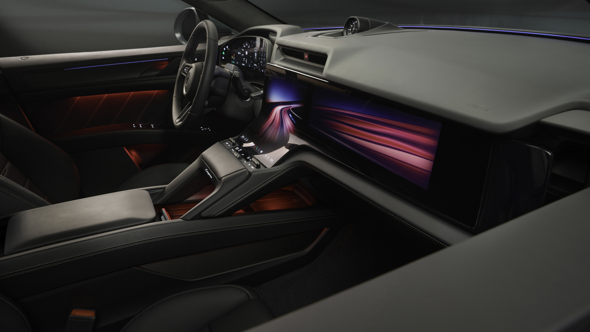 El habitáculo tiene cierto diseño inspirado en el 911, con una superficie mullida justo por debajo de la pantalla multimedia para apoyar la mano y darle estabilidad. Porsche llama a su pantalla Flow Display, una pantalla OLED curva que se une a un cuadro de instrumentos digital y, en opción, a un display para el acompañante. Este tiene como novedad que permite streaming de vídeo incluso en marcha sin distraer al conductor gracias a un filtro de privacidad (el conductor no ve la pantalla desde su posición).