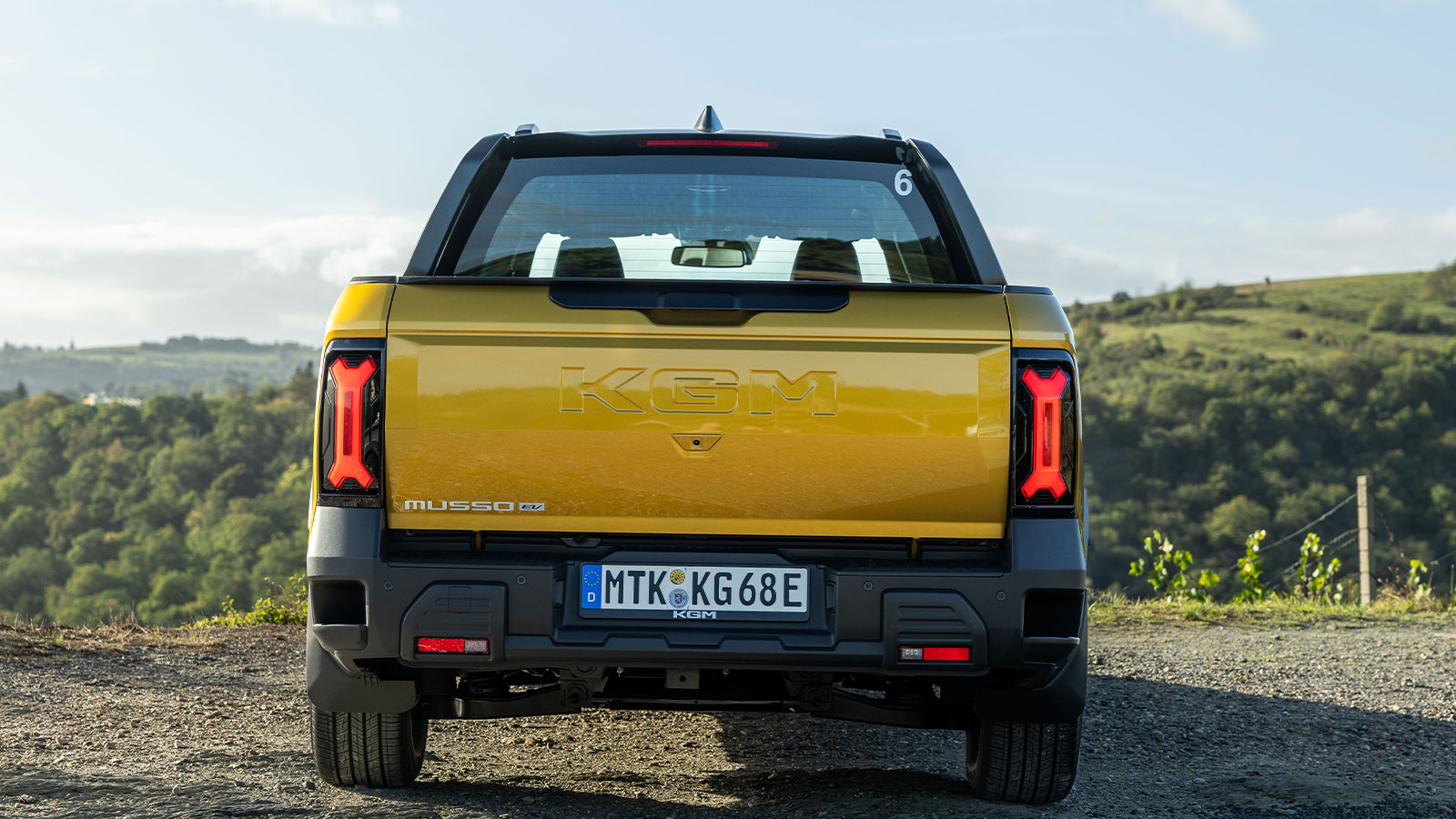 El diseño exterior tiene un aspecto robusto, con líneas cuadradas al más puro estilo 4×4, aunque lo combina con elementos más modernos, como una parrilla negra minimalista, faros LED de doble proyector y pasos de rueda marcados. La parte trasera incluye un gran emblema KGM troquelado en la puerta de la caja y ópticas LED de estilo industrial.